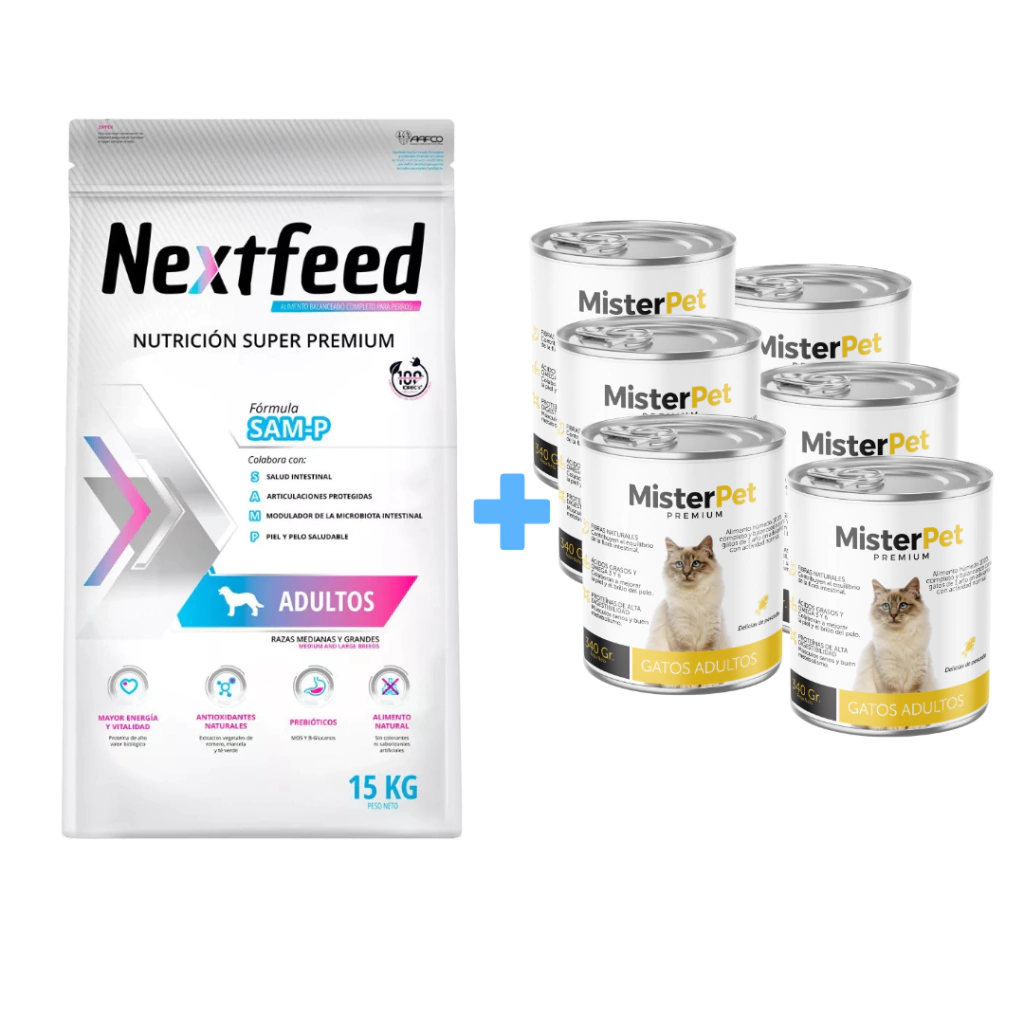 COMBO 3: 1 BOLSA NEXT FEED X 15KG + ALIMENTO HUMEDO GATOS ADULTOS PACK X 6 LATAS 340gr